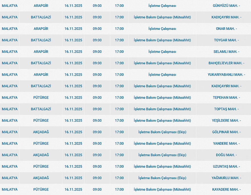 Malatya'da 16 Kasım'da 2025 Pazar günü Arapgir, Battalgazi, Pütürge, Akçadağ, Yeşilyurt, Darende ilçelerinde planlı bakım çalışmaları nedeniyle elektrik kesintisi yaşanacak. İşte elektrik kesintisi yaşayacak mahalleler…
