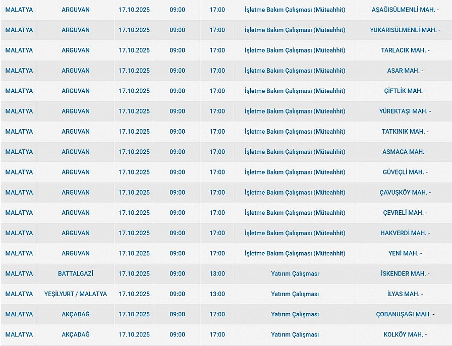 Malatya'da 17 Ekim 2025 Cuma günü Yeşilyurt, Akçadağ, Battalgazi, Doğanyol, Arguvan, Yazıhan, Hekimhan ilçelerinde planlı bakım çalışmaları nedeniyle elektrik kesintisi yaşanacak. İşte elektrik kesintisi yaşayacak mahalleler…