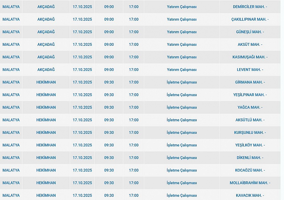 Malatya'da 17 Ekim 2025 Cuma günü Yeşilyurt, Akçadağ, Battalgazi, Doğanyol, Arguvan, Yazıhan, Hekimhan ilçelerinde planlı bakım çalışmaları nedeniyle elektrik kesintisi yaşanacak. İşte elektrik kesintisi yaşayacak mahalleler…