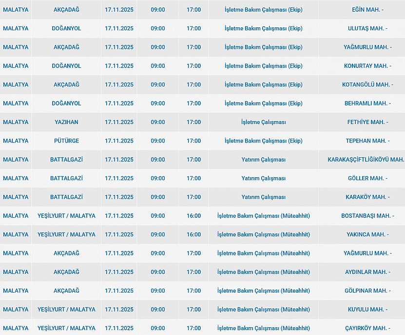 Malatya'da 17 Kasım'da 2025 Pazartesi günü Akçadağ, Doğanyol, Yazıhan, Pütürge, Battalgazi, Yeşilyurt, Doğanşehir ilçelerinde planlı bakım çalışmaları nedeniyle elektrik kesintisi yaşanacak. İşte elektrik kesintisi yaşayacak mahalleler…