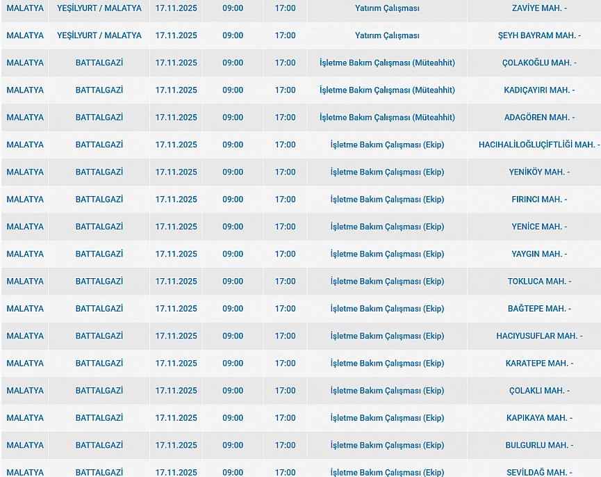 Malatya'da 17 Kasım'da 2025 Pazartesi günü Akçadağ, Doğanyol, Yazıhan, Pütürge, Battalgazi, Yeşilyurt, Doğanşehir ilçelerinde planlı bakım çalışmaları nedeniyle elektrik kesintisi yaşanacak. İşte elektrik kesintisi yaşayacak mahalleler…