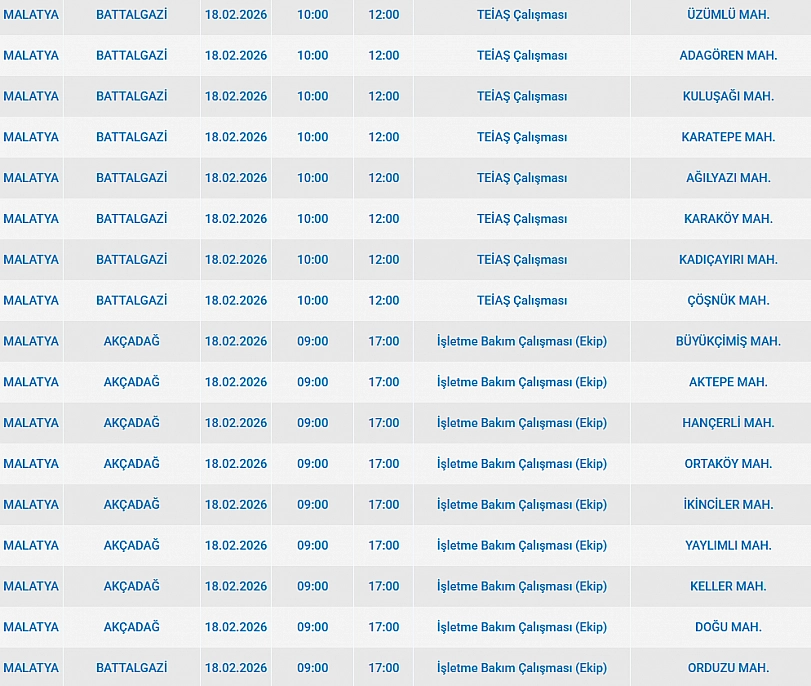 Malatya'da 18 Şubat 2026 Çarşamba günü Battalgazi, Akçadağ, Yeşilyurt ilçelerinde planlı bakım çalışmaları nedeniyle elektrik kesintisi yaşanacak. İşte elektrik kesintisi yaşayacak mahalleler…