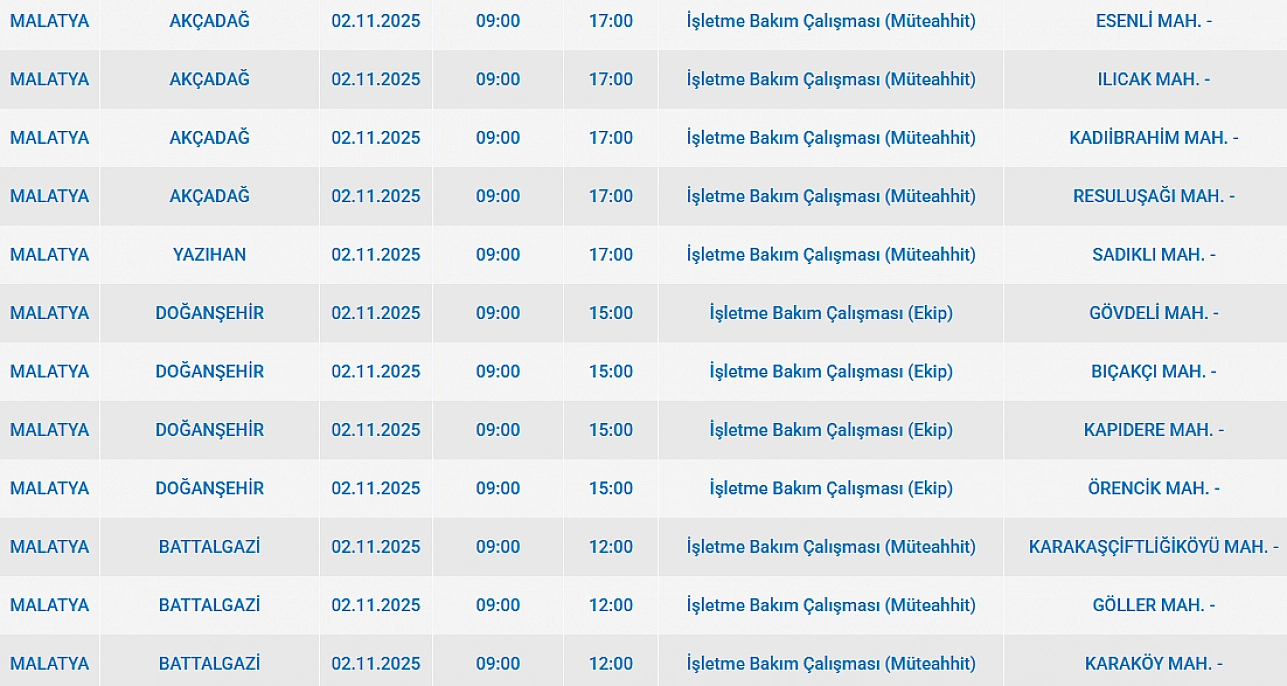 Malatya'da 2 Kasım'da 2025 Pazar günü Arguvan, Pütürge, Arapgir, Darende, Akçadağ, Yazıhan, Doğanşehir, Battalgazi ilçelerinde planlı bakım çalışmaları nedeniyle elektrik kesintisi yaşanacak. İşte elektrik kesintisi yaşayacak mahalleler…