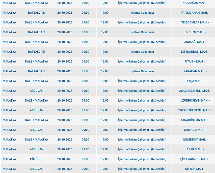 Malatya'da 20 Ekim 2025 Pazartesi günü Kale, Battalgazi, Arguvan, Pütürge, Doğanyol, Yeşilyurt, Akçadağ ilçelerinde planlı bakım çalışmaları nedeniyle elektrik kesintisi yaşanacak. İşte elektrik kesintisi yaşayacak mahalleler…