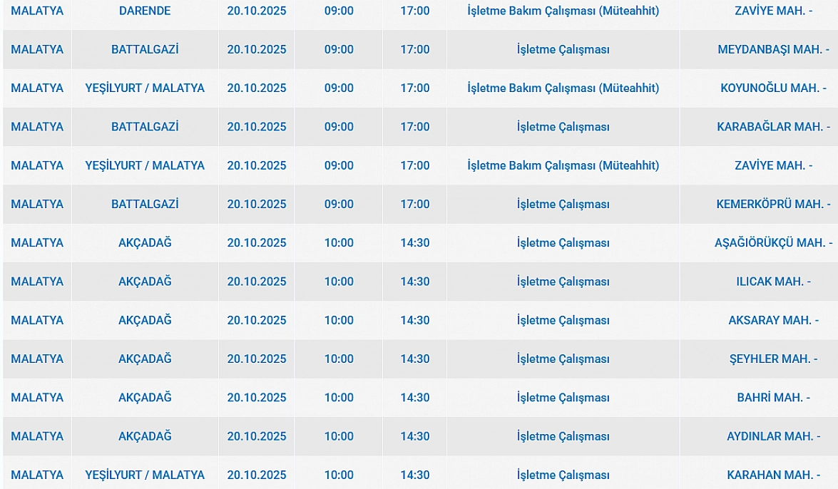Malatya'da 20 Ekim 2025 Pazartesi günü Kale, Battalgazi, Arguvan, Pütürge, Doğanyol, Yeşilyurt, Akçadağ ilçelerinde planlı bakım çalışmaları nedeniyle elektrik kesintisi yaşanacak. İşte elektrik kesintisi yaşayacak mahalleler…