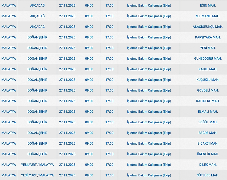 Malatya'da 21 Kasım'da 2025 Cuma günü Arapgir, Akçadağ, Doğanşehir, Yeşilyurt ilçelerinde planlı bakım çalışmaları nedeniyle elektrik kesintisi yaşanacak. İşte elektrik kesintisi yaşayacak mahalleler…