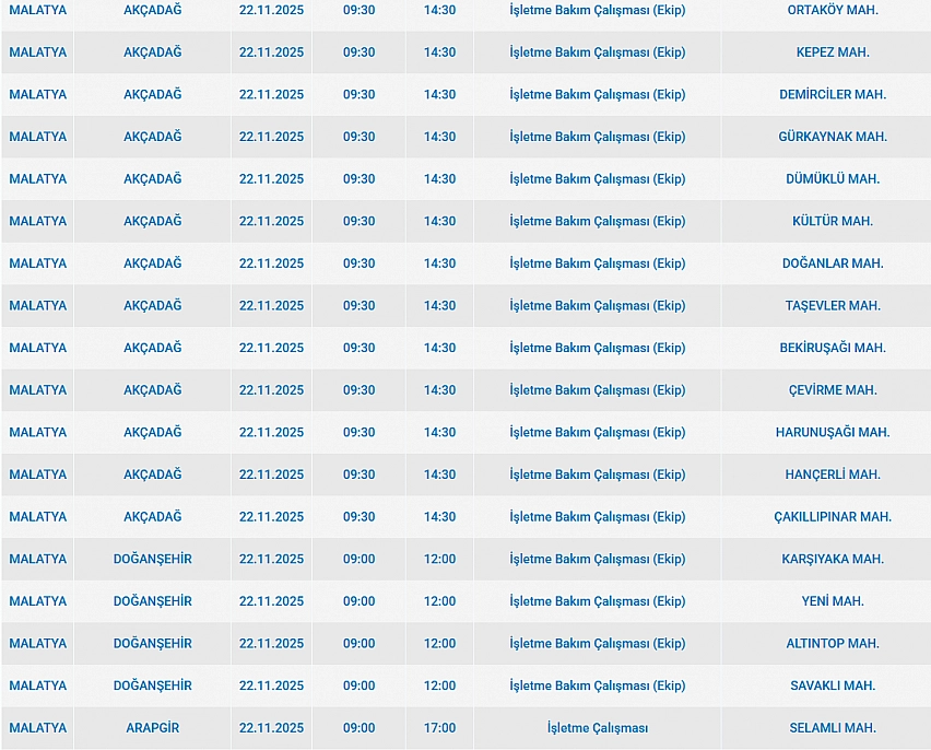 Malatya'da 22 Kasım'da 2025 Cumartesi günü Hekimhan, Yazıhan, Battalgazi, Yeşilyurt, Akçadağ, Doğanşehir, Pütürge ilçelerinde planlı bakım çalışmaları nedeniyle elektrik kesintisi yaşanacak. İşte elektrik kesintisi yaşayacak mahalleler…