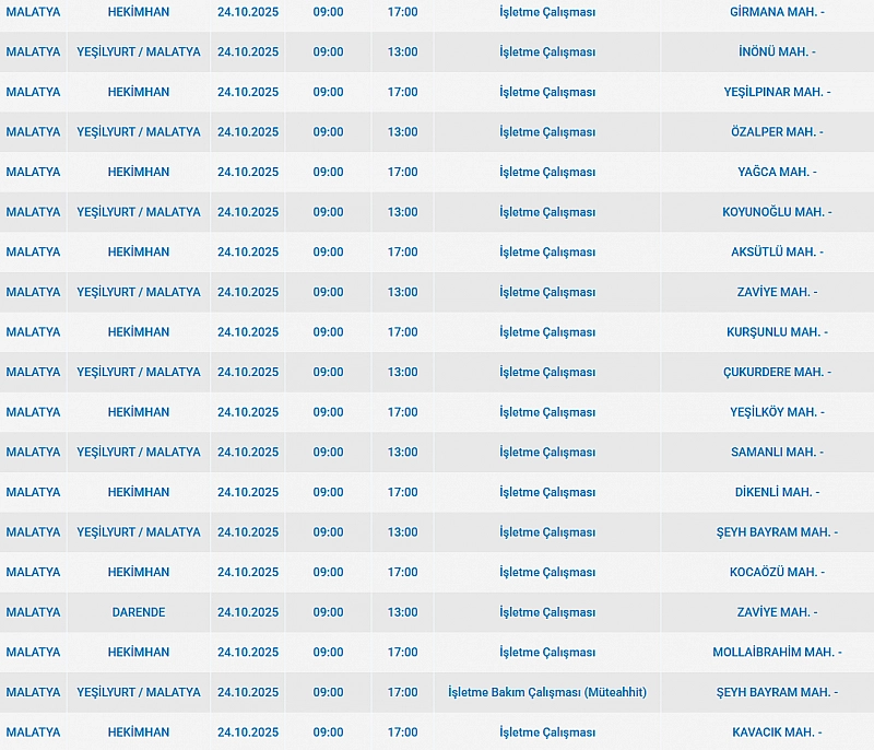 Malatya'da 24 Ekim 2025 Cuma günü Hekimhan, Yeşilyurt, Darende, Akçadağ, Yazıhan, Arguvan, Doğanyol, Arapgir ilçelerinde planlı bakım çalışmaları nedeniyle elektrik kesintisi yaşanacak. İşte elektrik kesintisi yaşayacak mahalleler…