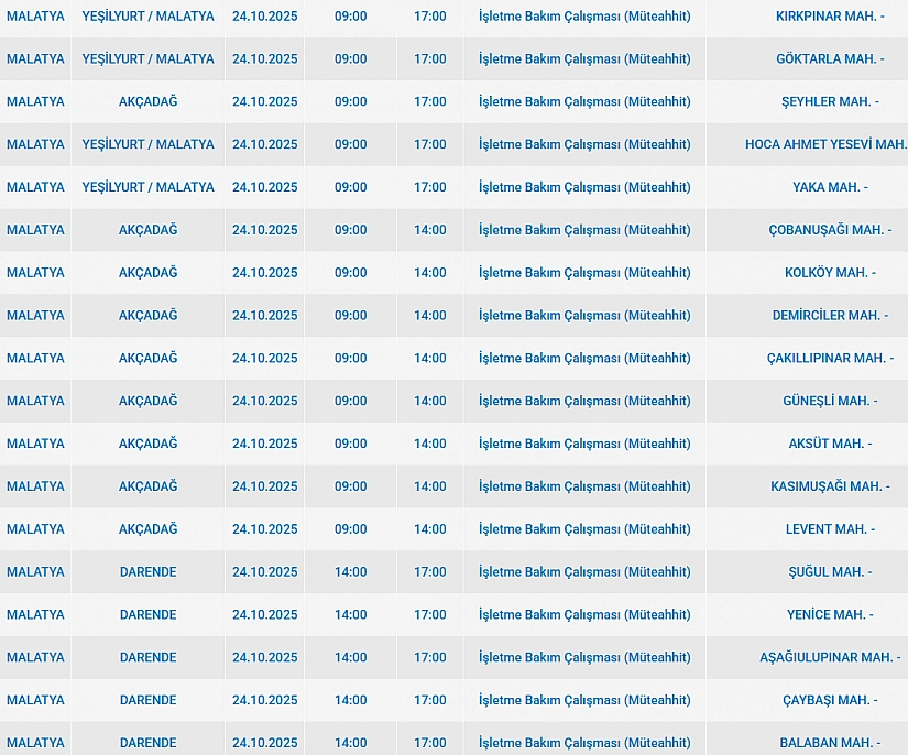 Malatya'da 24 Ekim 2025 Cuma günü Hekimhan, Yeşilyurt, Darende, Akçadağ, Yazıhan, Arguvan, Doğanyol, Arapgir ilçelerinde planlı bakım çalışmaları nedeniyle elektrik kesintisi yaşanacak. İşte elektrik kesintisi yaşayacak mahalleler…