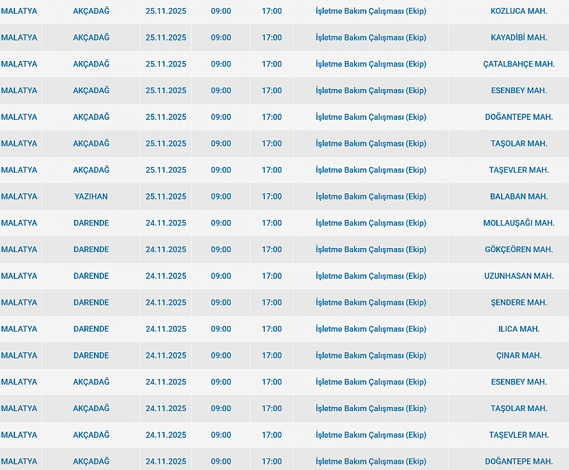 Malatya'da 24 Kasım'da 2025 Pazartesi günü Battalgazi, Doğanşehir, Yeşilyurt, Arguvan, Arapgir, Doğanyol, Hekimhan, Yazıhan, Akçadağ, Darende ilçelerinde planlı bakım çalışmaları nedeniyle elektrik kesintisi yaşanacak. İşte elektrik kesintisi yaşayacak mahalleler…