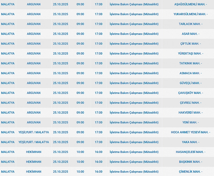 Malatya'da 25 Ekim 2025 Cumartesi günü Battalgazi, Arapgir, Hekimhan, Arguvan, Darende ilçelerinde planlı bakım çalışmaları nedeniyle elektrik kesintisi yaşanacak. İşte elektrik kesintisi yaşayacak mahalleler…