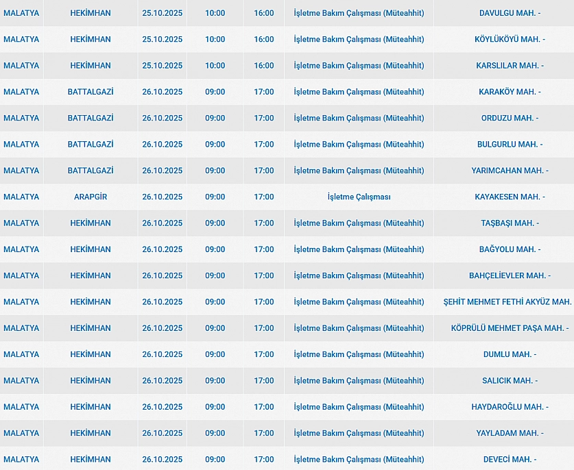 Malatya'da 25 Ekim 2025 Cumartesi günü Battalgazi, Arapgir, Hekimhan, Arguvan, Darende ilçelerinde planlı bakım çalışmaları nedeniyle elektrik kesintisi yaşanacak. İşte elektrik kesintisi yaşayacak mahalleler…