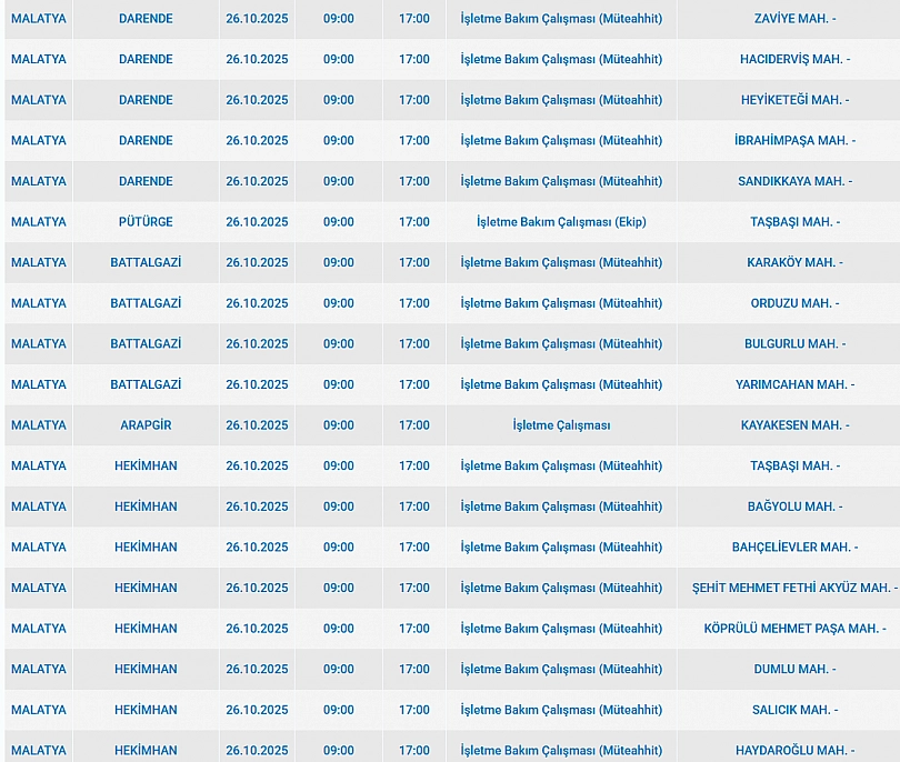 Malatya'da 26 Ekim 2025 Pazar günü Darende, Pütürge, Battalgazi, Arapgir, Hekimhan, Arguvan ilçelerinde planlı bakım çalışmaları nedeniyle elektrik kesintisi yaşanacak. İşte elektrik kesintisi yaşayacak mahalleler…