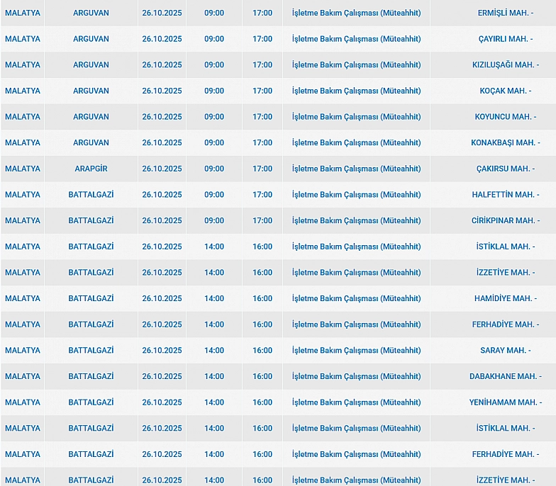 Malatya'da 26 Ekim 2025 Pazar günü Darende, Pütürge, Battalgazi, Arapgir, Hekimhan, Arguvan ilçelerinde planlı bakım çalışmaları nedeniyle elektrik kesintisi yaşanacak. İşte elektrik kesintisi yaşayacak mahalleler…