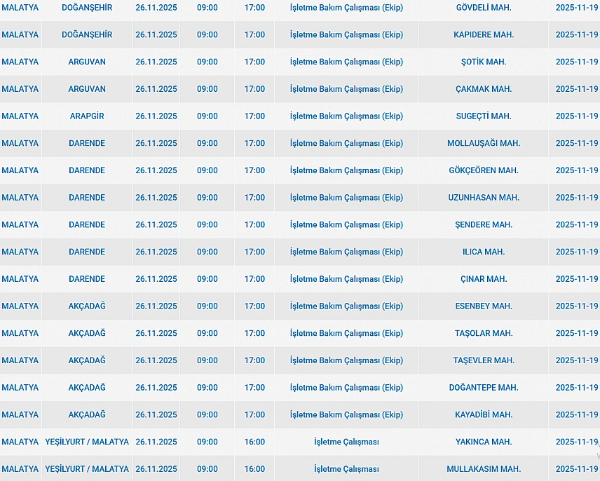 Malatya'da 26 Kasım'da 2025 Çarşamba günü Doğanşehir, Darende, Akçadağ, Arguvan, Arapgir, Yeşilyurt, Battalgazi ilçelerinde planlı bakım çalışmaları nedeniyle elektrik kesintisi yaşanacak. İşte elektrik kesintisi yaşayacak mahalleler…