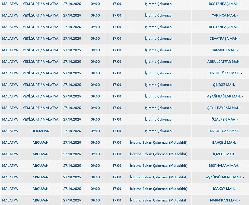 Malatya'da 27 Ekim 2025 Pazartesi günü Yeşilyurt, Hekimhan, Arguvan, Yazıhan, Arapgir, Battalgazi, Darende ilçelerinde planlı bakım çalışmaları nedeniyle elektrik kesintisi yaşanacak. İşte elektrik kesintisi yaşayacak mahalleler…