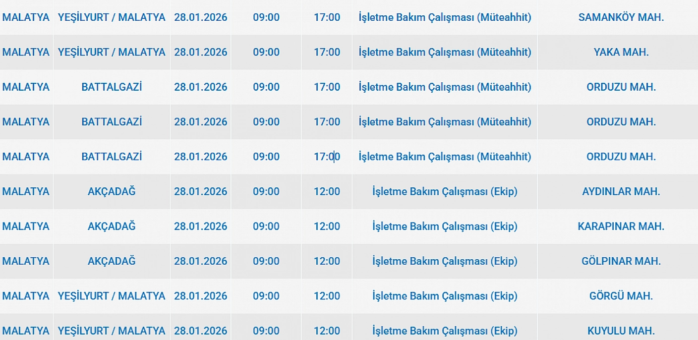 Malatya'da 28 Ocak 2025 Çarşamba günü Yeşilyurt, Akçadağ, Battalgazi ilçelerinde planlı bakım çalışmaları nedeniyle elektrik kesintisi yaşanacak. İşte elektrik kesintisi yaşayacak mahalleler…