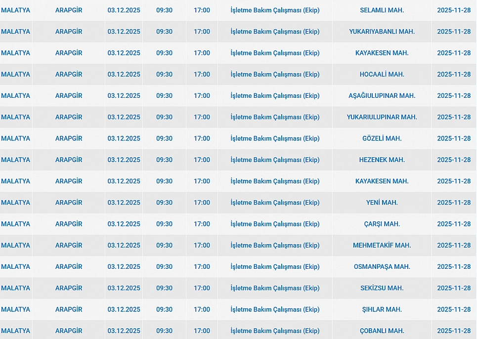 Malatya'da 3 Aralık'ta 2025 Çarşamba günü Akçadağ, Yeşilyurt, Hekimhan, Arapgir ilçelerinde planlı bakım çalışmaları nedeniyle elektrik kesintisi yaşanacak. İşte elektrik kesintisi yaşayacak mahalleler…