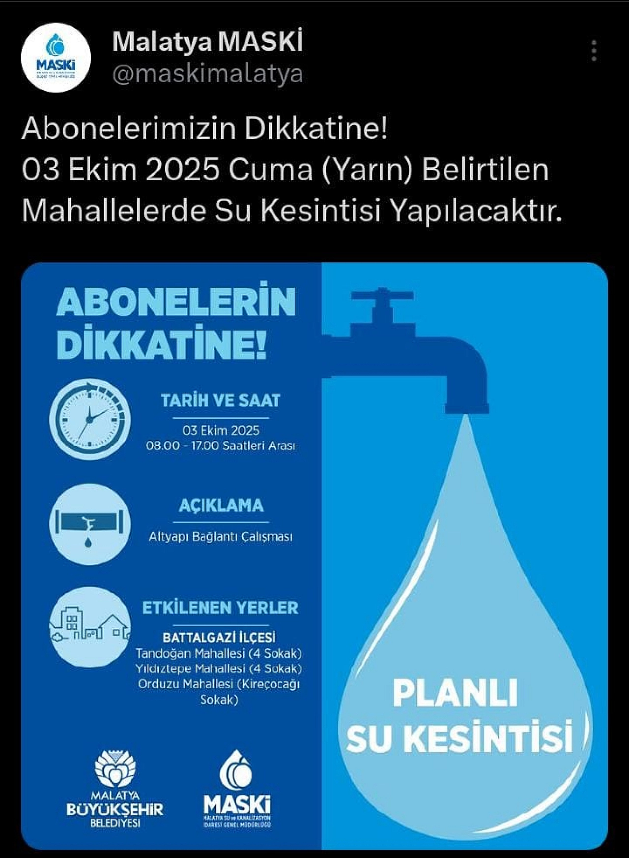 Malatya Su ve Kanalizasyon İdaresi (MASKİ) Genel Müdürlüğü tarafından yapılan açıklamaya göre, Battalgazi ilçesinde planlanan içme suyu hattı bağlantı çalışmaları nedeniyle 3 mahallede 03 Ekim 2025 Cuma günü saat 08.00 ile 17.00 arasında su kesintisi yaşanacak.