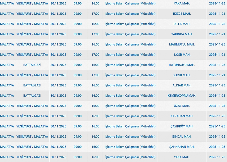 Malatya'da 30 Kasım'da 2025 Pazar günü Yeşilyurt, Akçadağ, Battalgazi, Pütürge ilçelerinde planlı bakım çalışmaları nedeniyle elektrik kesintisi yaşanacak. İşte elektrik kesintisi yaşayacak mahalleler…