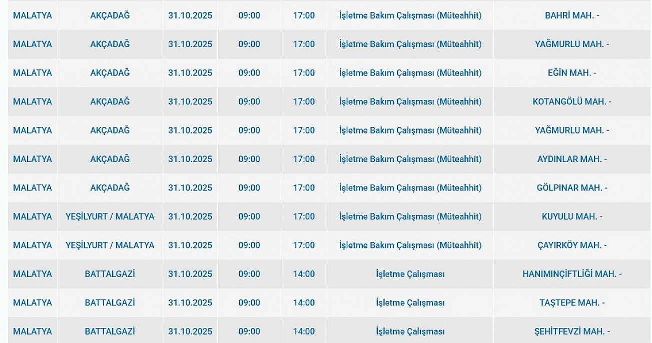 Malatya'da 31 Ekim 2025 Cuma günü Battalgazi, Doğanşehir, Akçadağ, Pütürge, Arguvan, Yeşilyurt ilçelerinde planlı bakım çalışmaları nedeniyle elektrik kesintisi yaşanacak. İşte elektrik kesintisi yaşayacak mahalleler…