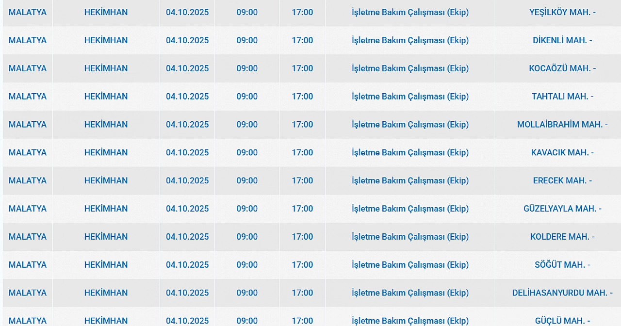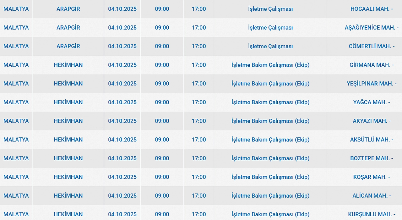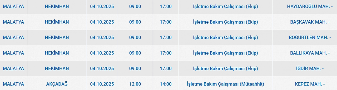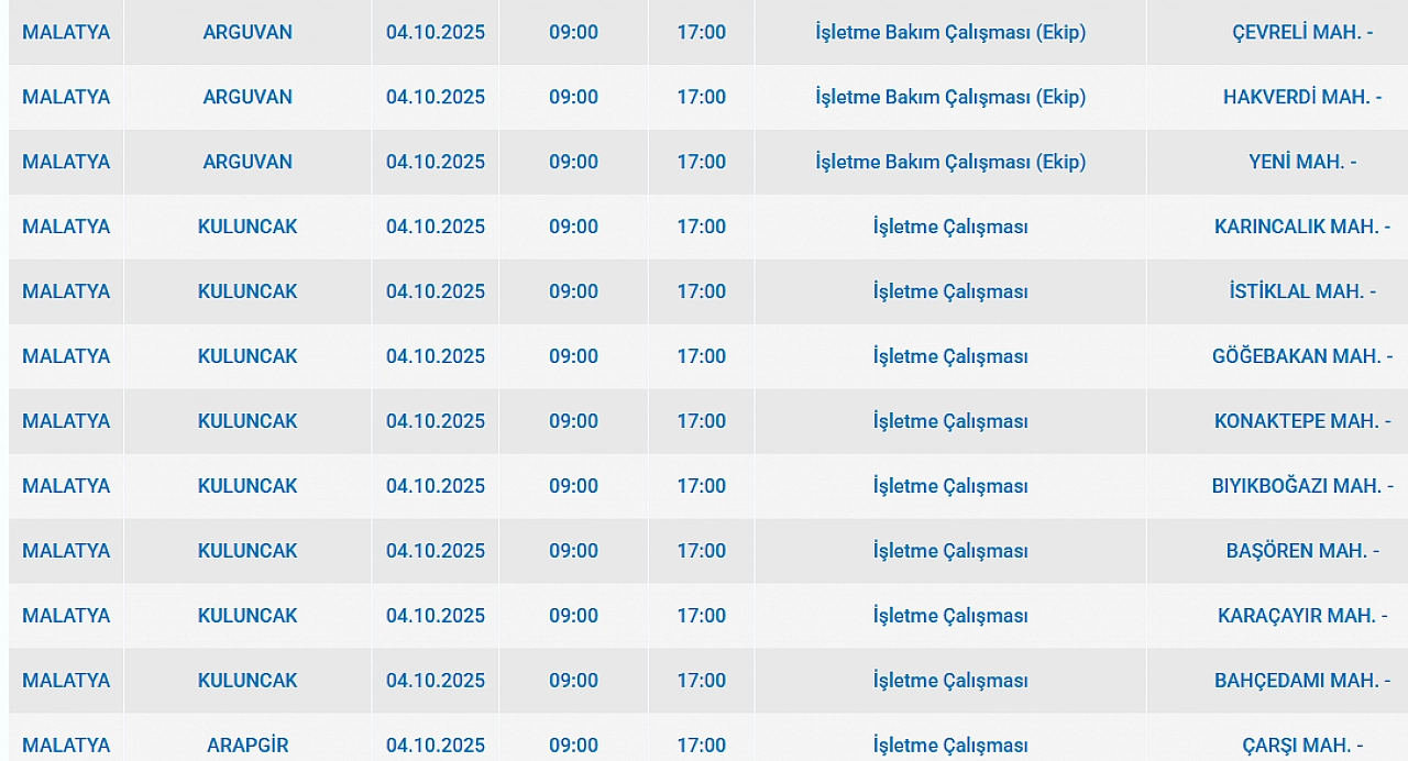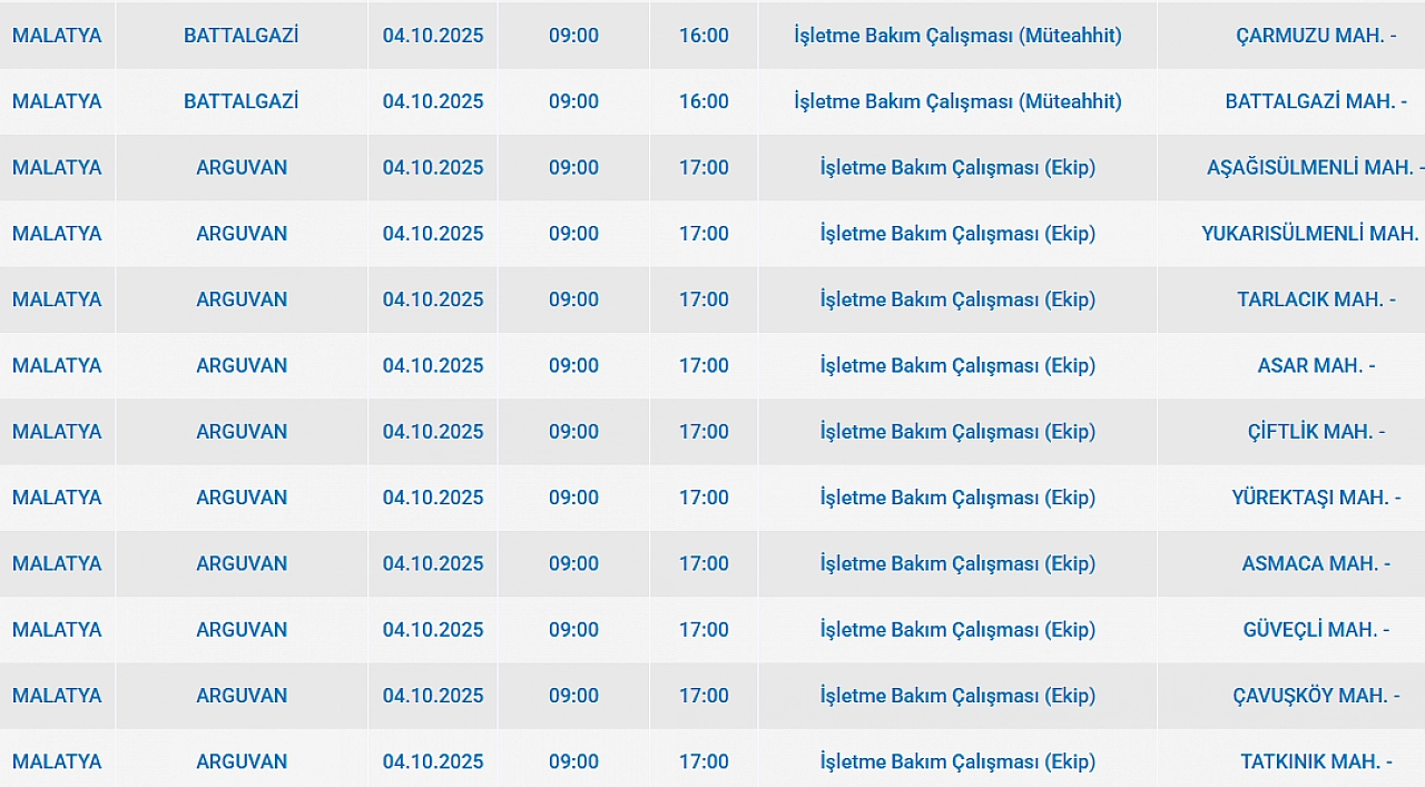 Malatya'da 4 Ekim 2025 Cumartesi günü Battalgazi, Arguvan Kuluncak, Arapgir, Hekimhan ilçelerinde planlı bakım çalışmaları nedeniyle elektrik kesintisi yaşanacak. İşte elektrik kesintisi yaşayacak mahalleler…
