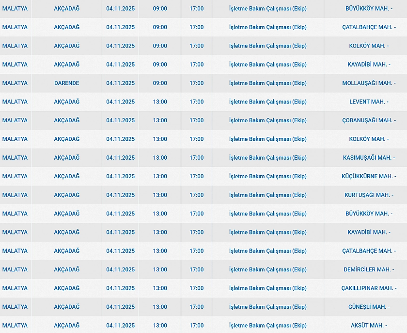 Malatya'da 4 Kasım Salı günü Pütürge, Battalgazi, Yeşilyurt, Akçadağ, Darende ilçelerinde planlı bakım çalışmaları nedeniyle elektrik kesintisi yaşanacak. İşte elektrik kesintisi yaşayacak mahalleler…