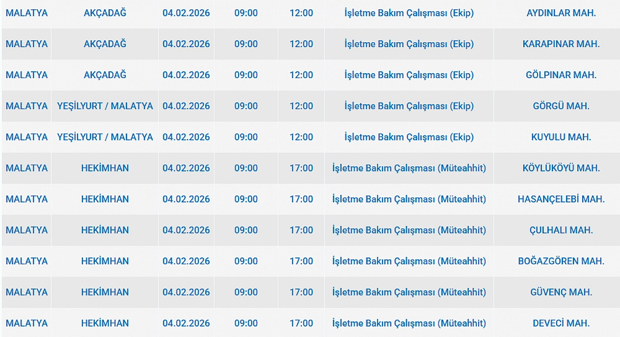 Malatya'da 4 Şubat 2025 Çarşamba günü Hekimhan, Yeşilyurt, Akçadağ ilçelerinde planlı bakım çalışmaları nedeniyle elektrik kesintisi yaşanacak. İşte elektrik kesintisi yaşayacak mahalleler…