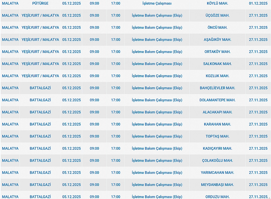 Malatya'da 5 Aralık'ta 2025 Cuma günü Yeşilyurt, Battalgazi, Pütürge, Kale, Akçadağ, Darende ilçelerinde planlı bakım çalışmaları nedeniyle elektrik kesintisi yaşanacak. İşte elektrik kesintisi yaşayacak mahalleler…