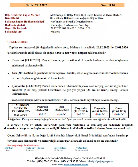 Meteoroloji 13. Bölge Müdürlüğü, Malatya'yı etkisi altına alması beklenen soğuk hava ve kar yağışı dalgasına ilişkin 5 günlük hava tahmin raporunu yayımladı. Meteoroloji rapora göre kent genelinde kar yağışıyla birlikte buzlanma ve don olaylarının etkili olması bekleniyor.