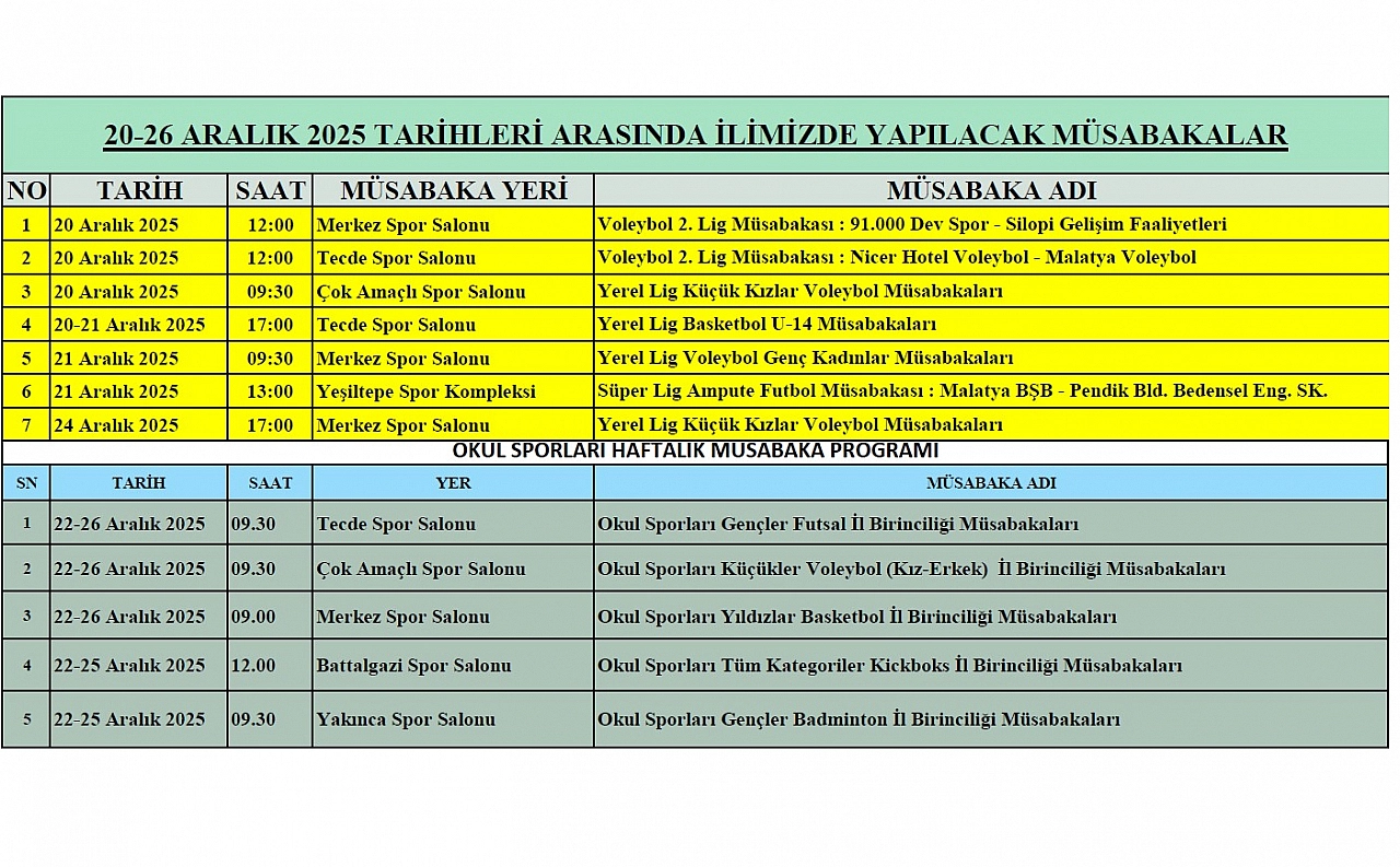 Malatya Gençlik ve Spor İl Müdürlüğü, 20-24 Aralık 2025 tarihleri arasında kentte yapılacak müsabakaları duyurdu İşte detaylar…