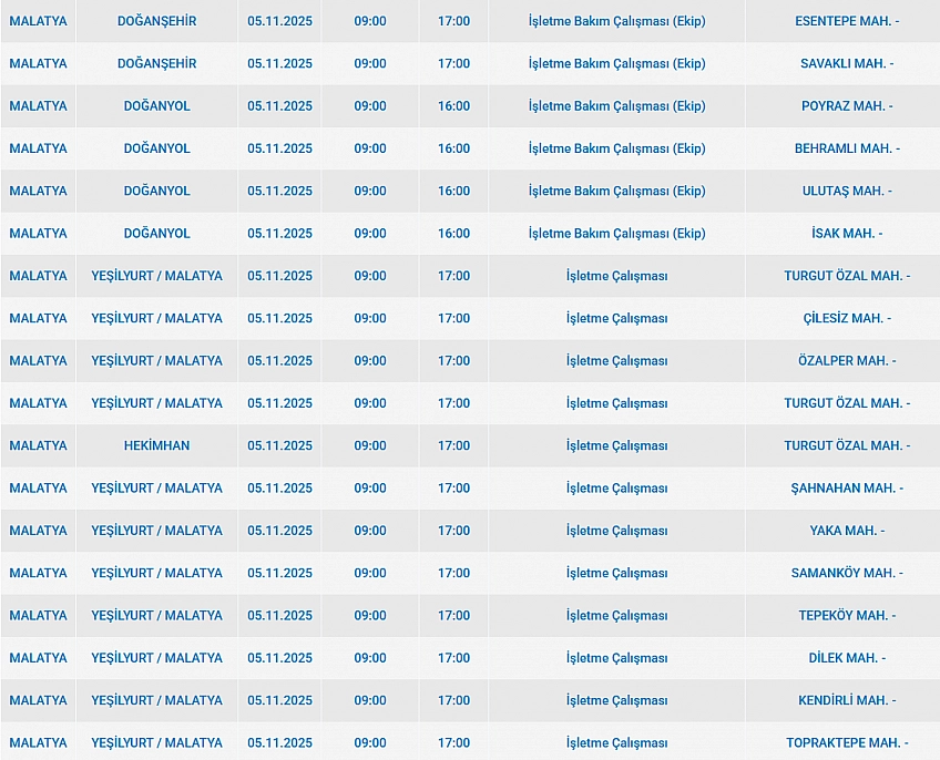 Malatya'da 5 Kasım'da 2025 Çarşamba günü Hekimhan, Akçadağ, Doğanşehir, Kuluncak, Doğanyol, Yeşilyurt ilçelerinde planlı bakım çalışmaları nedeniyle elektrik kesintisi yaşanacak. İşte elektrik kesintisi yaşayacak mahalleler…