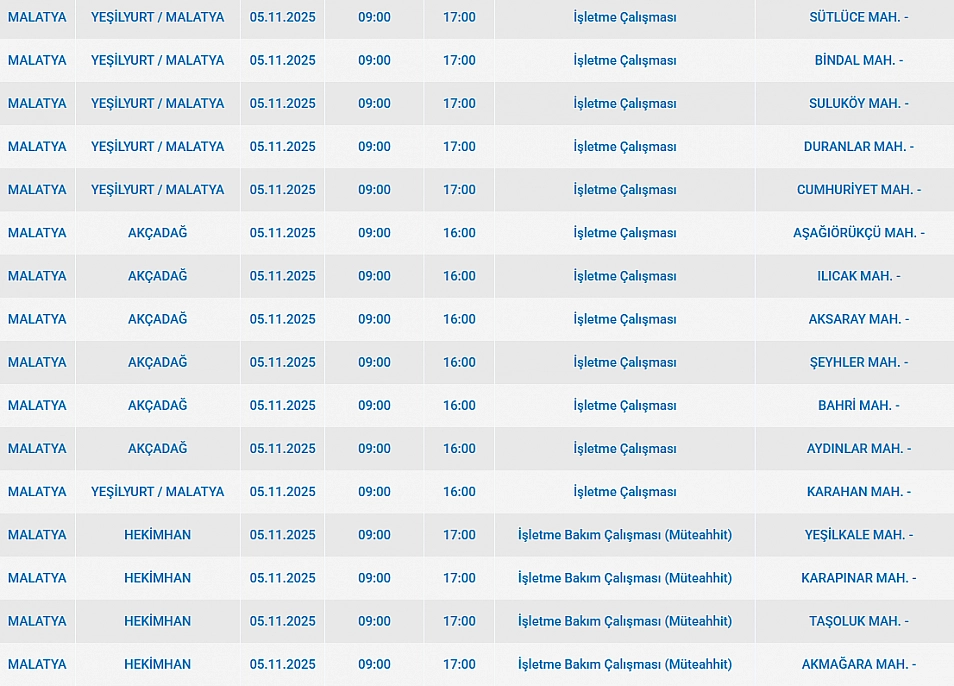 Malatya'da 5 Kasım'da 2025 Çarşamba günü Hekimhan, Akçadağ, Doğanşehir, Kuluncak, Doğanyol, Yeşilyurt ilçelerinde planlı bakım çalışmaları nedeniyle elektrik kesintisi yaşanacak. İşte elektrik kesintisi yaşayacak mahalleler…