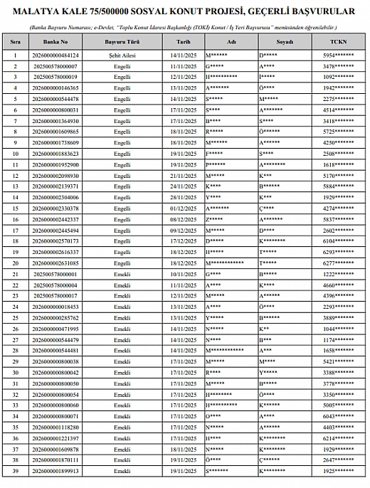 Çevre, Şehircilik ve İklim Değişikliği Bakanı Murat Kurum'un öncülüğünde yürütülen TOKİ 500 Bin Sosyal Konut Projesi kapsamında Malatya'da yapılacak kura çekimi öncesinde heyecan arttı. 17 Ocak'ta gerçekleştirilecek kura öncesi, kuraya katılacak ve başvurusu reddedilen adayların isim listeleri yayımlandı.