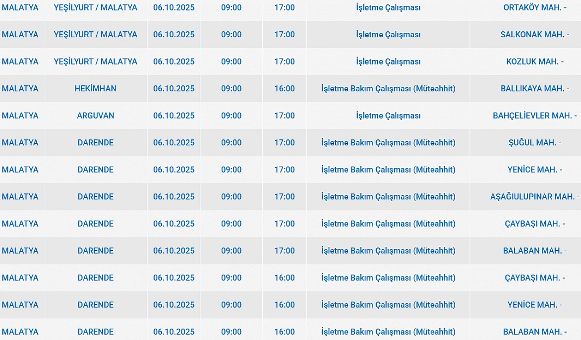 Malatya'da 6 Ekim 2025 Pazartesi günü Akçadağ, Arapgir, Yeşilyurt, Hekimhan, Arguvan, Darende, Battalgazi ilçelerinde planlı bakım çalışmaları nedeniyle elektrik kesintisi yaşanacak. İşte elektrik kesintisi yaşayacak mahalleler…