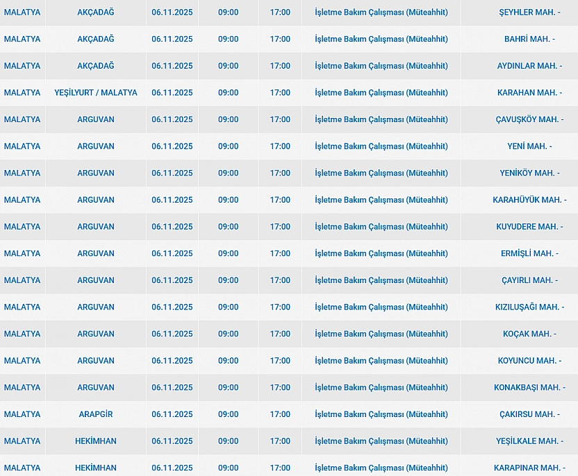 Malatya'da 6 Kasım 2025 Perşembe günü Darende, Akçadağ, Yazıhan, Kuluncak, Hekimhan, Doğanşehir, Yeşilyurt, Battalgazi, Arguvan, Arapgir ilçelerinde planlı bakım çalışmaları nedeniyle elektrik kesintisi yaşanacak. İşte elektrik kesintisi yaşayacak mahalleler…