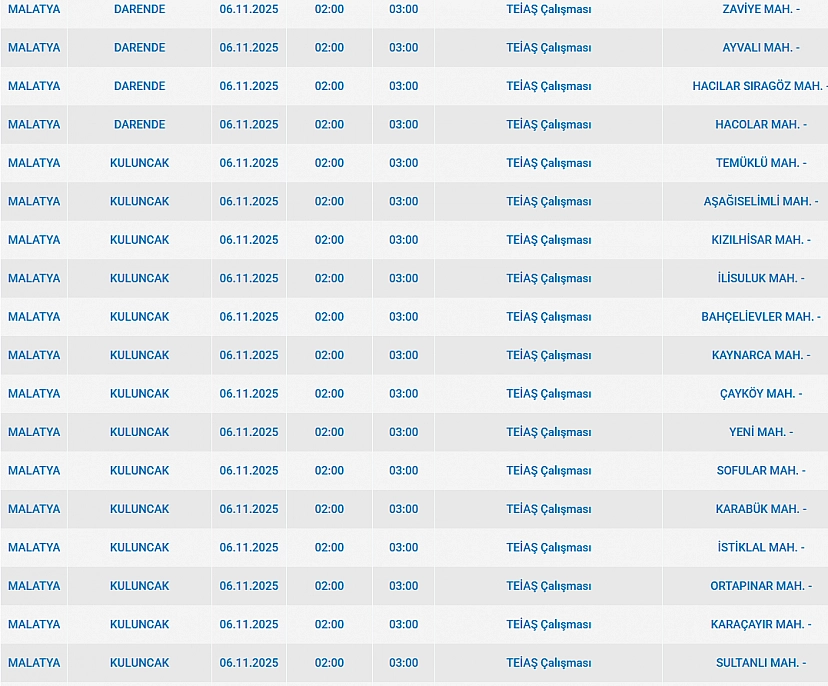 Malatya'da 6 Kasım 2025 Perşembe günü Darende, Akçadağ, Yazıhan, Kuluncak, Hekimhan, Doğanşehir, Yeşilyurt, Battalgazi, Arguvan, Arapgir ilçelerinde planlı bakım çalışmaları nedeniyle elektrik kesintisi yaşanacak. İşte elektrik kesintisi yaşayacak mahalleler…