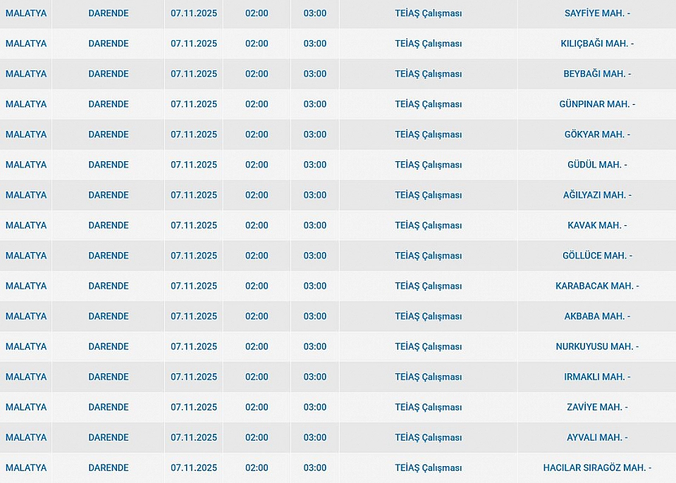Malatya'da 7 Kasım'da 2025 Cuma günü Hekimhan, Akçadağ, Kale, Arguvan, Battalgazi, Kuluncak, Arapgir, Darende, Yeşilyurt ilçelerinde planlı bakım çalışmaları nedeniyle elektrik kesintisi yaşanacak. İşte elektrik kesintisi yaşayacak mahalleler…