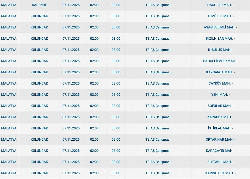 Malatya'da 7 Kasım'da 2025 Cuma günü Hekimhan, Akçadağ, Kale, Arguvan, Battalgazi, Kuluncak, Arapgir, Darende, Yeşilyurt ilçelerinde planlı bakım çalışmaları nedeniyle elektrik kesintisi yaşanacak. İşte elektrik kesintisi yaşayacak mahalleler…