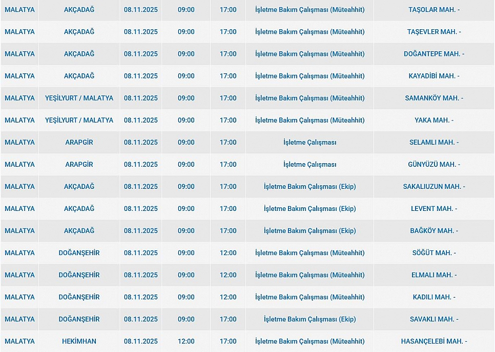 Malatya'da 8 Kasım'da 2025 Cumartesi günü Hekimhan, Doğanşehir, Akçadağ, Arapgir, Darende, Yeşilyurt ilçelerinde planlı bakım çalışmaları nedeniyle elektrik kesintisi yaşanacak. İşte elektrik kesintisi yaşayacak mahalleler…