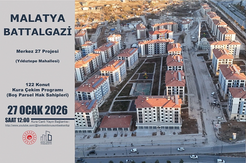 - 27 Ocak 2026 Salı saat 12.00’de Battalgazi İlçesi Yıldıztepe Mahallesinde hayata geçirilen Merkez 27 Projesi kapsamında (Boş Parsel Hak Sahipleri) 122 konutun kurası noter huzurunda gerçekleştirilecek.
