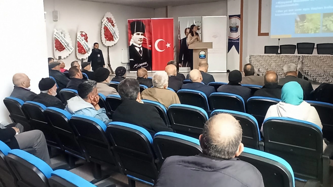 Kale Belediyesi Toplantı Salonunda gerçekleştirilen eğitim programında Ziraat Mühendisi Şevket Fidan, meyve bahçelerinde zirai ve biyolojik mücadele, gübreleme, sulama, ilaçlama ile ilkbahar bahçe bakımı gibi konularında çiftçilere bilgi verdi.