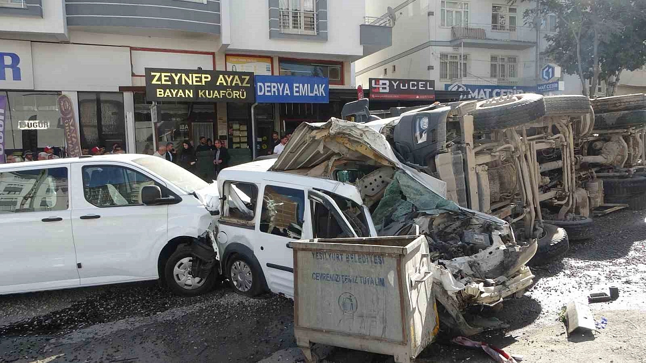 Malatya'da freni patlayan mıcır yüklü hafriyat kamyonu, ışıkta bekleyen ve park halindeki araçlara çarptıktan sonra devrilerek yan yattı. Kazada 5 kişi yaralanırken, 15 araçta hasar meydana geldi.