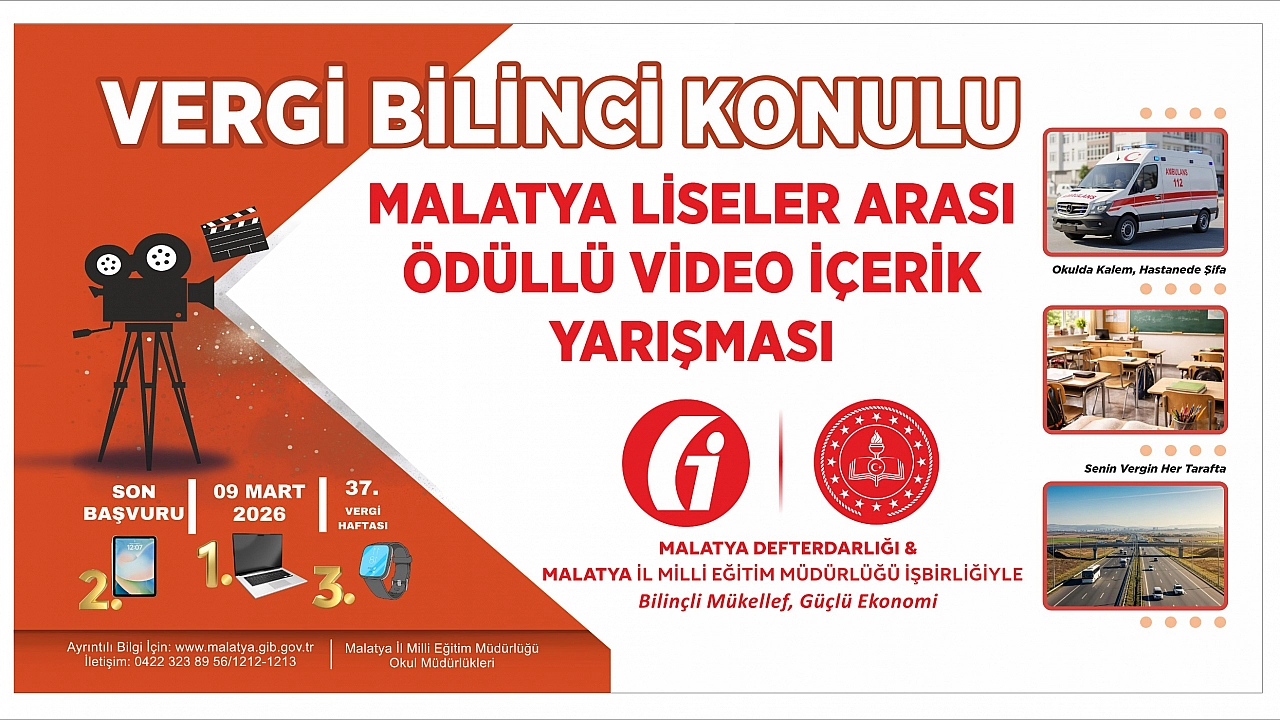 Geleceğin bilinçli bireylerini yetiştirmek amacıyla yürütülen vergi bilinci çalışmaları kapsamında, Malatya Defterdarlığı ile Malatya İl Millî Eğitim Müdürlüğü iş birliğinde lise öğrencilerine yönelik 'Vergi Bilinci Konulu Video İçerik Yarışması' başlatıldı.