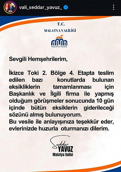 Malatya Valisi Seddar Yavuz, Yeşilyurt ilçesine bağlı İkizce Mahallesi TOKİ 2. Bölge 4. Etap konutlarında tespit edilen eksikliklerin 10 gün içinde tamamlanacağını açıkladı. Vali Yavuz, ilgili kurum ve firmalarla gerekli görüşmelerin yapıldığını ve tüm eksikliklerin en kısa sürede giderileceği sözünü aldıklarını ifade etti.