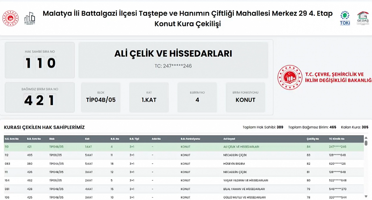 6 Şubat depremlerinde büyük yıkım yaşayan Malatya'da kalıcı konut ve iş yeri projeleri hızla tamamlanıyor. Battalgazi ilçesine bağlı Taştepe ve Hanımınçiftliği mahallelerinde Merkez 29. 4. Etap kapsamında yapılan kura çekimiyle 389 hak sahibi belirlendi.