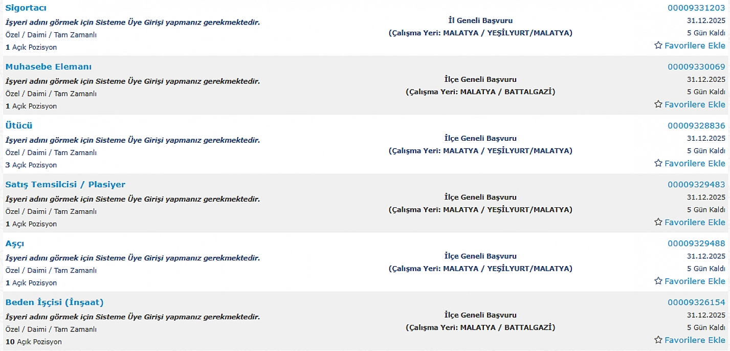 İŞKUR, Malatya'da farklı sektörlerde istihdam edilmek üzere toplam 124 kişilik personel alımı yapılacağını duyurdu. Alımlar, Depocu (Giyim Üretim), Beden İşçisi (Genel), Ahşap Mobilya İmalatçısı, Direksiyon/Sürücü Eğitmeni, Aşçı, Makine Bakım ve Onarımcısı, Tekstil Mühendisi ve Tekstil Laborantı başta olmak üzere birçok pozisyonda gerçekleştirilecek. İşte detaylar…
