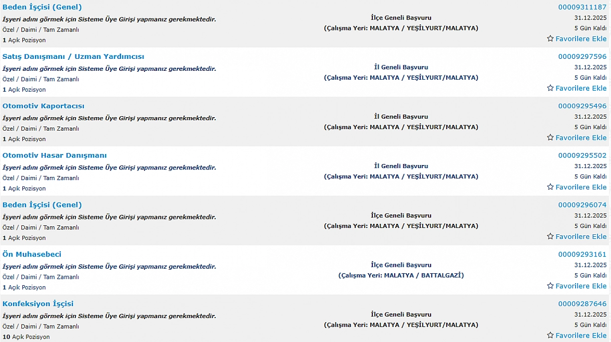 İŞKUR, Malatya'da farklı sektörlerde istihdam edilmek üzere toplam 124 kişilik personel alımı yapılacağını duyurdu. Alımlar, Depocu (Giyim Üretim), Beden İşçisi (Genel), Ahşap Mobilya İmalatçısı, Direksiyon/Sürücü Eğitmeni, Aşçı, Makine Bakım ve Onarımcısı, Tekstil Mühendisi ve Tekstil Laborantı başta olmak üzere birçok pozisyonda gerçekleştirilecek. İşte detaylar…