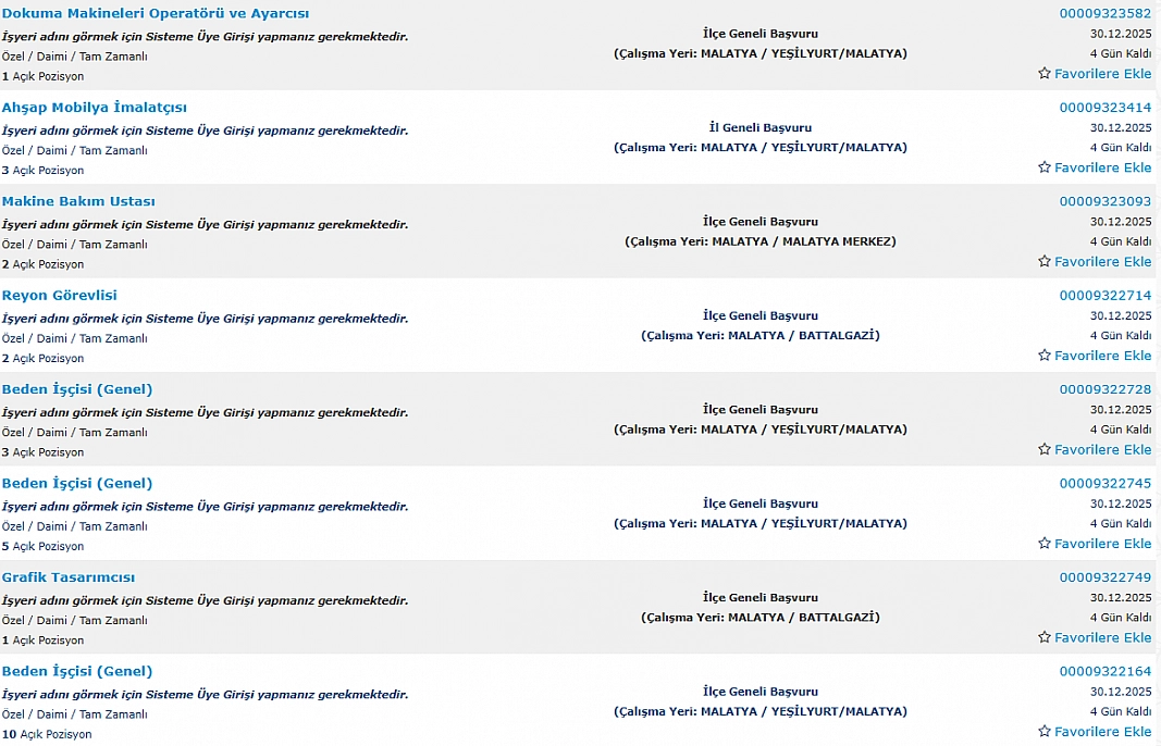 İŞKUR, Malatya'da farklı sektörlerde istihdam edilmek üzere toplam 124 kişilik personel alımı yapılacağını duyurdu. Alımlar, Depocu (Giyim Üretim), Beden İşçisi (Genel), Ahşap Mobilya İmalatçısı, Direksiyon/Sürücü Eğitmeni, Aşçı, Makine Bakım ve Onarımcısı, Tekstil Mühendisi ve Tekstil Laborantı başta olmak üzere birçok pozisyonda gerçekleştirilecek. İşte detaylar…