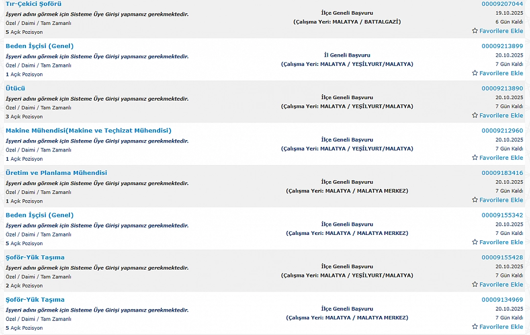 İŞKUR, Malatya'da farklı sektörlerde istihdam edilmek üzere toplam 183 kişilik personel alımı yapılacağını duyurdu. Tır-Çekici Şoförü, Makine Mühendisi (Makine ve Teçhizat Mühendisi), Ön Muhasebeci, Mekanik Bakım Onarımcısı, Elektrik Teknisyeni, İnşaat Mühendisi gibi birçok pozisyonda istihdam sağlanacak. İşte detaylar…